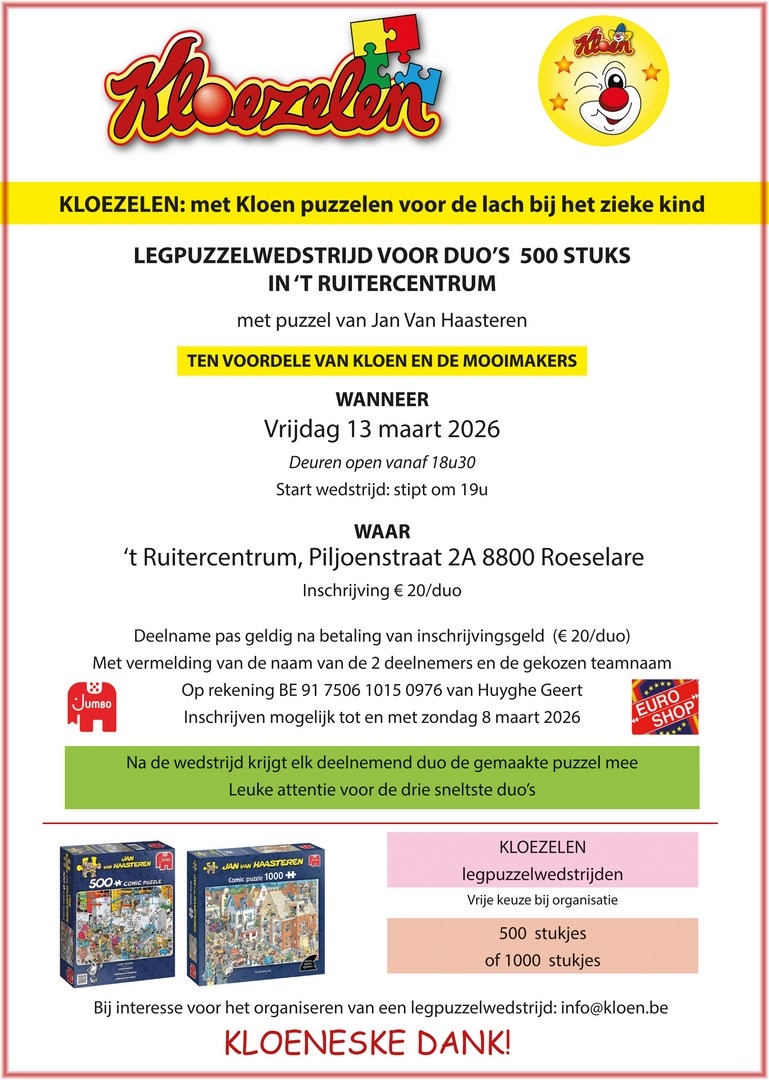 Een eerste lepuzzelavond gaat door op vrijdag 13 maart 2026 in 't Ruitercentrum, Piljoenstraat 2A te Roeselare en is t.v.v. KLOEN én DE MOOIMAKERS.